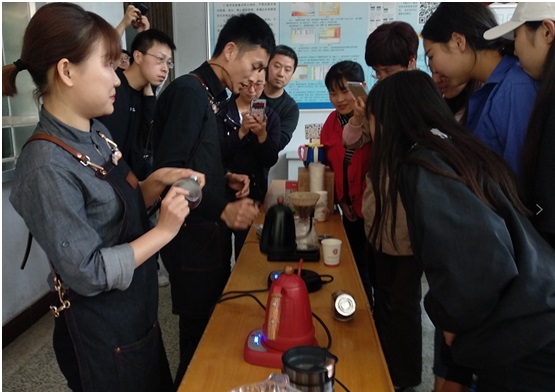活动特邀市某知名咖啡店首席咖啡师讲解,近百名学生现场参与。