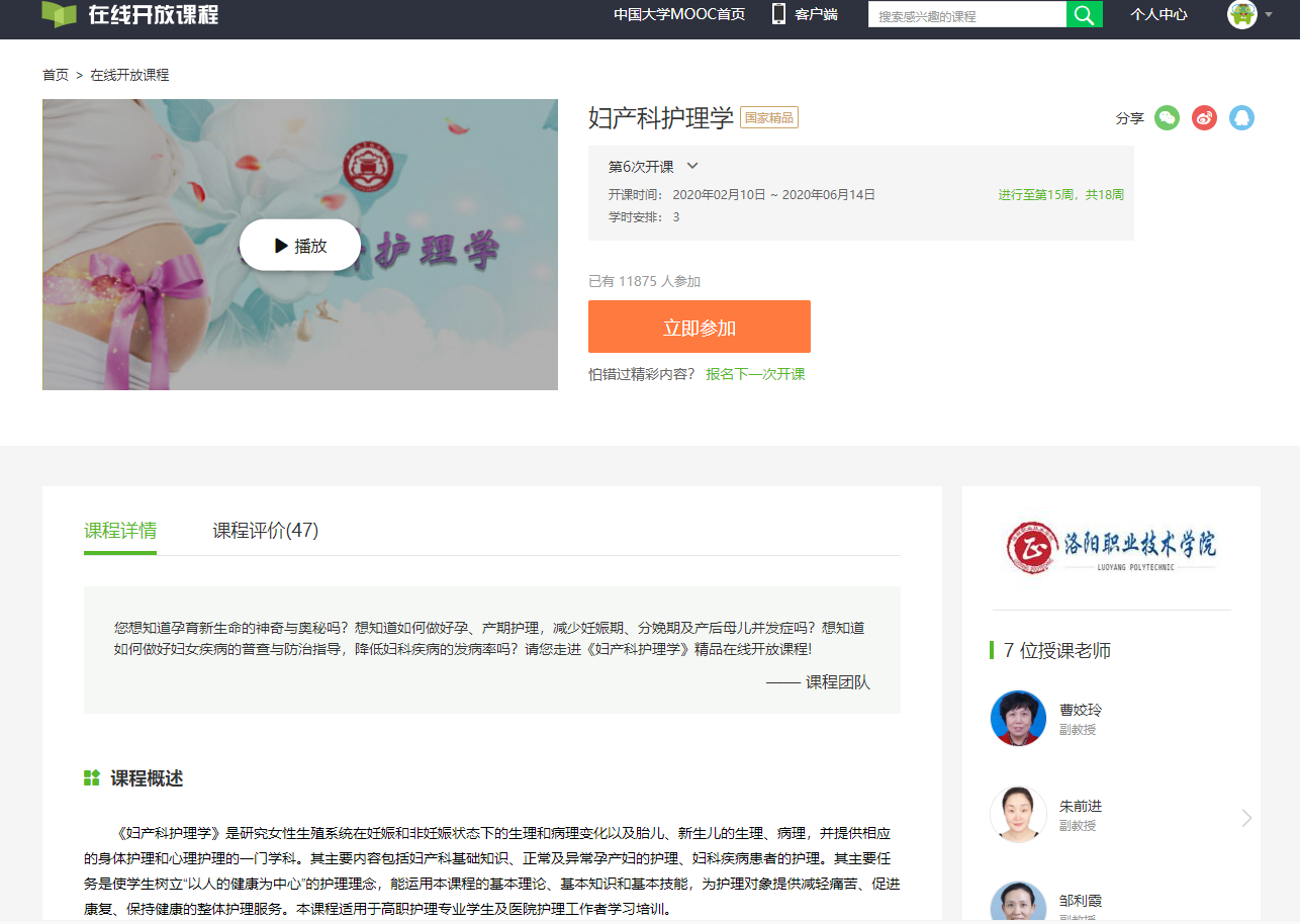 2018年,由我院曹娇玲副教授作为主要负责人在中国大学MOOC(慕课)平台开设的《妇产科护理学》课程成功入选国家精品在线开放课程。该课程自今年2月中旬第六次开课后,选课人数已达到11875人次(截止发稿前MOOC数据),受到了本校及省内外师生的一致好评。