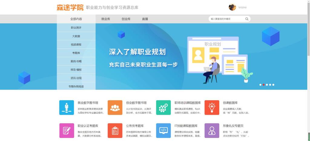《森途学院》按照职业创业发展路径,整合视频、数据、资讯、法律法律法规、案例、文书、报告、题库等各类优质资源,同时提供在线测评、模拟演练等服务,为高校的就业创业教育提供提供整体化解决方案。围绕学生就业、创业、职场、考证、综合素质等方面优化设置,按照用户自主学习以及引导式学习两种学习进行设置网站结构,并结合图书馆特有的资源内容展示方式,使其更全面、更便捷、更高效。