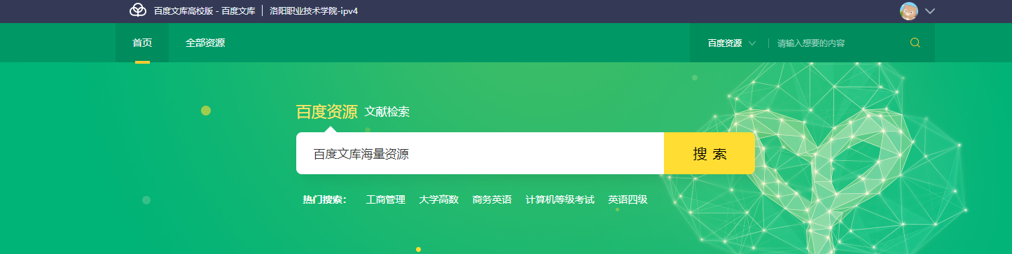 百度文库是全球最大的中文文档分享平台,百度文库高校版为百度文库为高校用户提供服务的专业平台。我校图书馆即日起开通百度文库高校版试用,校内网用户均可登陆访问。试用期间如有问题和建议可咨询图书馆读者综合服务部,联系电话:0379-62302557。
