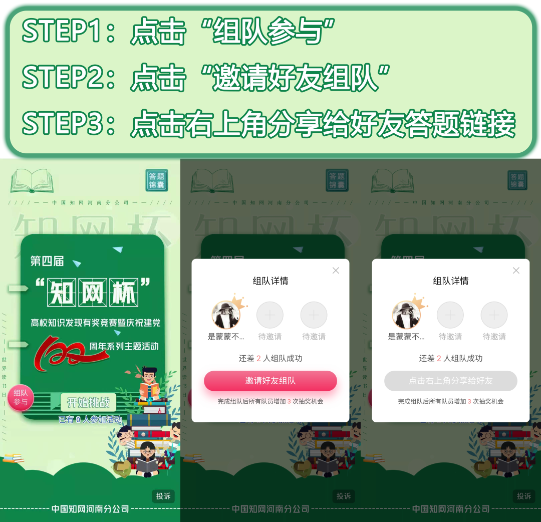 在活动开始页面,点击组队参与,邀请2位未参赛的小伙伴进行组队答题,组队成功后,队内每位成员即可额外获得3次抽奖机会。