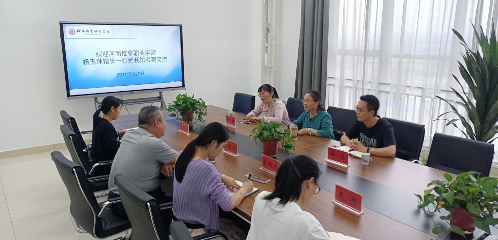 2021年6月10日下午,河南推拿职业学院图书馆杨玉萍馆长一行到我馆参观交流。图书馆馆长翟君军、副馆长李双双和文献采编部、读者服务部相关人员热情接待了来客。