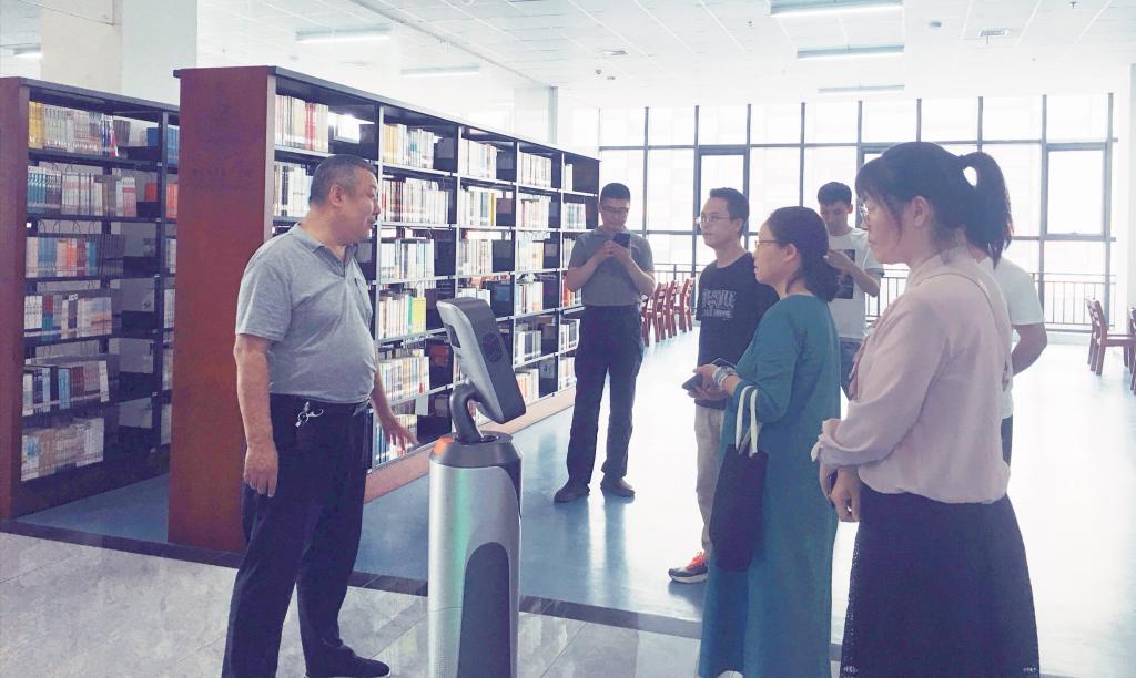 河南推拿职业学院图书馆一行在馆长翟君军的带领和解说下,依次参观了一楼密集书库、三楼图书阅览区、电子文献服务区、阅读研习区等区域。随后,双方在七楼会议室就图书馆自助借还系统、智能化设施设备建设等方面进行了广泛交流。会后,两馆人员均表示收获良多,并希望今后可以继续加强交流学习。