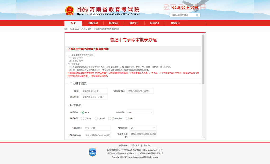 二、根据《河南省教育厅办公室文件》教办职成(2019)266号文件,关于推行中等职业教育学历证明书网上办理服务和进一步规范学历认证工作通知中,第三条中的第2小项中的第(1)条,学校录取审批表丢失或登记不清晰(含印章不清楚)、损毁的属于普通中专的,申请人可到河南省招生工作办公室服务大厅(郑州市郑东新区熊儿河路1号)查询获取。现在河南省教育考试院可在网上申请普通中专录取表,申请方法,河南省教育考试院官网→服务大厅→网上服务→普通中专录取审批表办理。